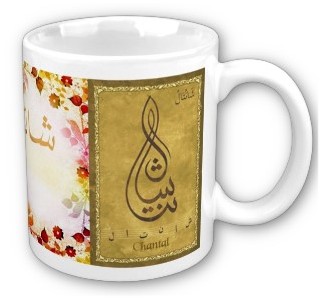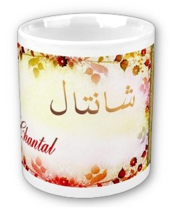 Mug avec le prénom "Chantal" calligraphié en arabe (شانتال) ainsi que son épellation lettre par lettre en arabe.