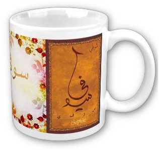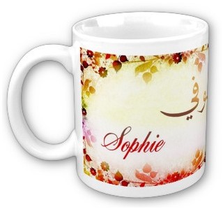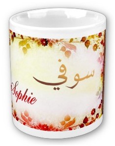 Mug avec le prénom "Sophie" calligraphié en arabe (سوفي) ainsi que son épellation lettre par lettre en arabe.