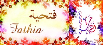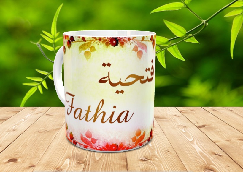 Mug avec le prénom "Fathia" écrit en français, en arabe (فتحية) et calligraphié de façon artistique en arabe sur la partie droite.