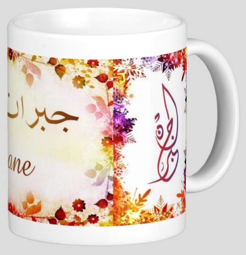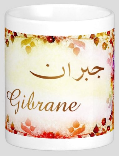 Mug avec le prénom "Gibrane" écrit en français, en arabe (جبران) et calligraphié de façon artistique en arabe sur la partie droite.