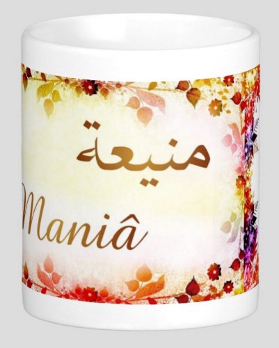 Mug avec le prénom "Maniâ" écrit en français, en arabe (منيعة) et calligraphié de façon artistique en arabe sur la partie droite.