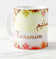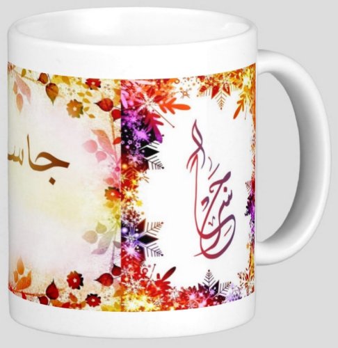 Mug avec le prénom "Jassir" écrit en français, en arabe (جاسر) et calligraphié de façon artistique en arabe sur la partie droite.
