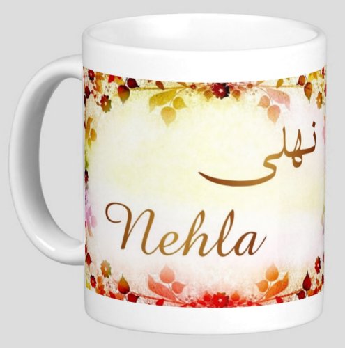 Mug avec le prénom "Nehla" écrit en français, en arabe (نهلى) et calligraphié de façon artistique en arabe sur la partie droite.