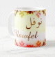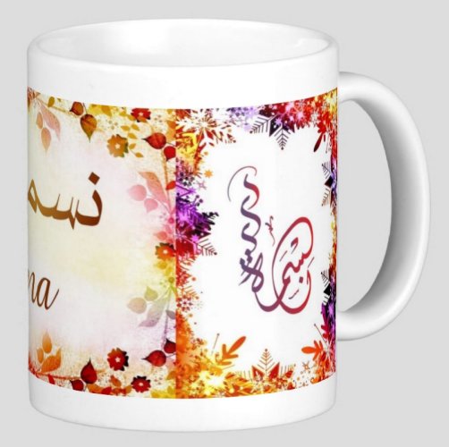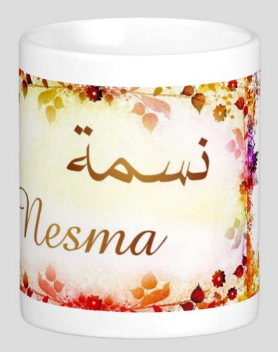 Mug avec le prénom "Nesma" écrit en français, en arabe (نسمة) et calligraphié de façon artistique en arabe sur la partie droite.