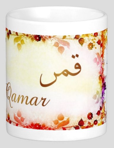 Mug avec le prénom "Qamar" écrit en français, en arabe (قمر) et calligraphié de façon artistique en arabe sur la partie droite.