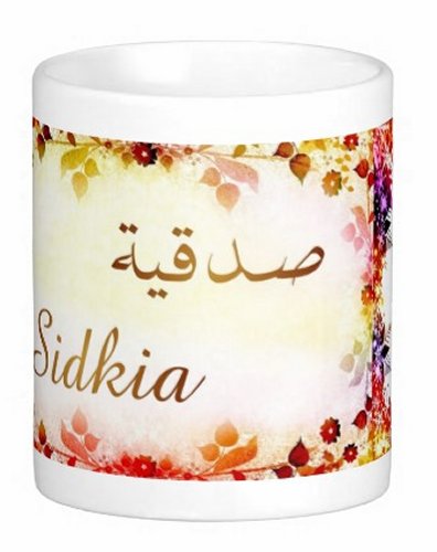 Mug avec le prénom "Sidkia" écrit en français, en arabe (صدقية) et calligraphié de façon artistique en arabe sur la partie droite.
