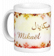 Mug avec le prénom "Wifak" écrit en français, en arabe (وفاق) et calligraphié de façon artistique en arabe sur la partie droite.