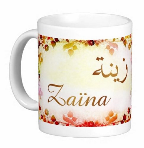 Mug avec le prénom "Zaïna" écrit en français, en arabe (زينة) et calligraphié de façon artistique en arabe sur la partie droite.