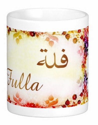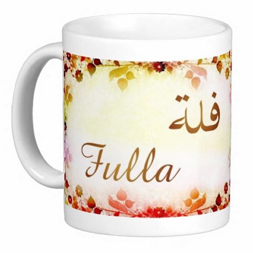 Mug avec le prénom "Fulla" écrit en français, en arabe (فلة) et calligraphié de façon artistique en arabe sur la partie droite.
