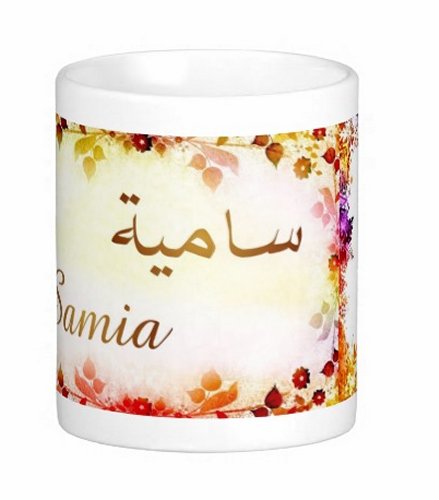 Mug avec le prénom "Samia" écrit en français, en arabe (سامية) et calligraphié de façon artistique en arabe sur la partie droite.