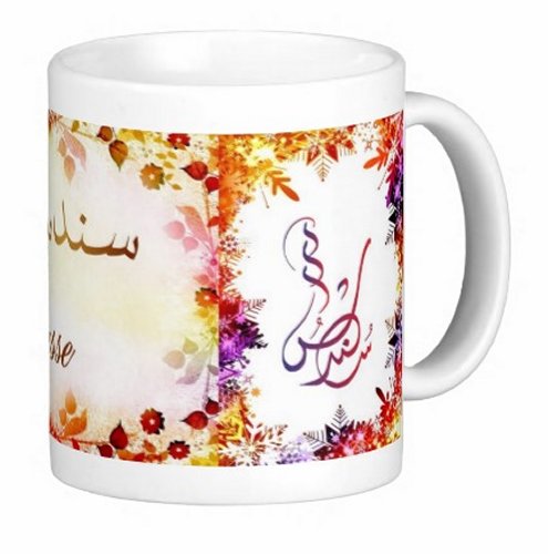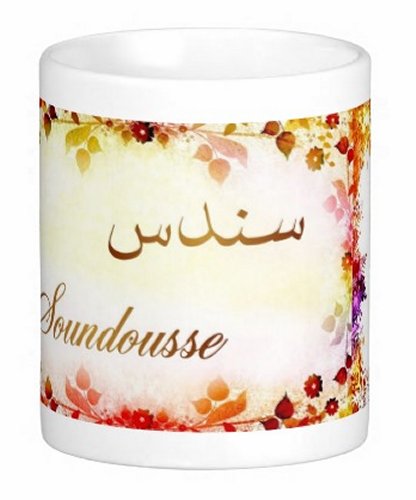 Mug avec le prénom "Soundousse" écrit en français, en arabe (سندس) et calligraphié de façon artistique en arabe sur la partie droite.