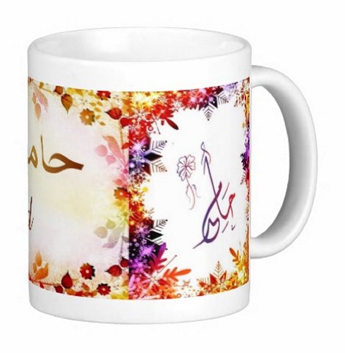 Mug avec le prénom "Hâmid" écrit en français, en arabe (حامد) et calligraphié de façon artistique en arabe sur la partie droite.