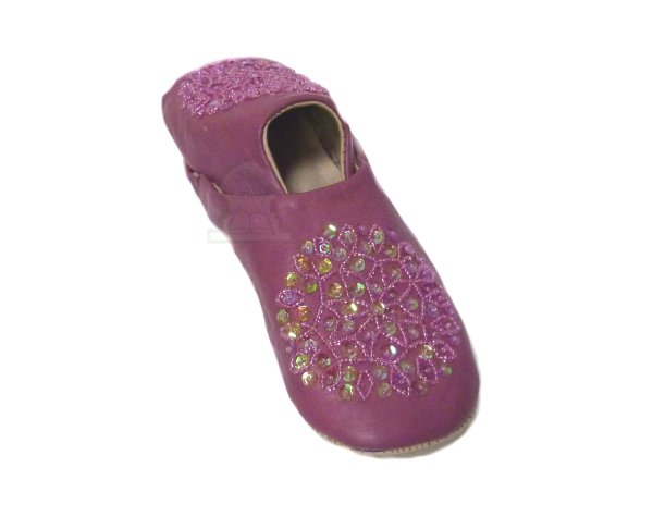 Babouche traditionnelle marocaine, style berbère, en cuir de couleur violette pour femmes. Ces babouches possèdent un bout - une extrémité - arrondi(e), pour plus de confort à l'intérieur. Elles sont décorées de jolis motifs en fleurs en strasses et en perles...