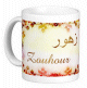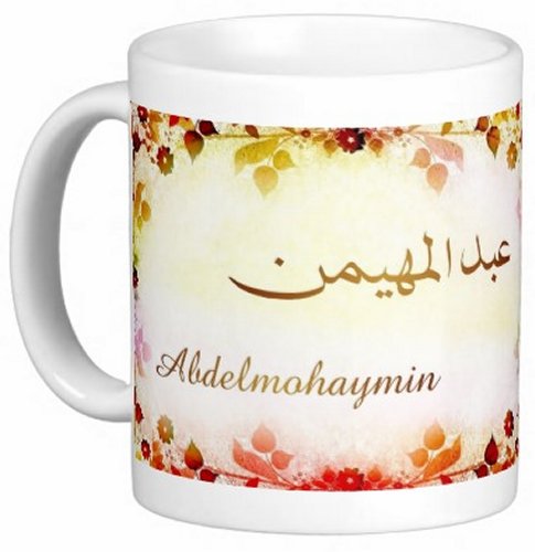 Mug avec le prénom "Abdelmohaymin" écrit en français, en arabe (عبد المهيمن) et calligraphié de façon artistique en arabe sur la partie droite.