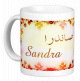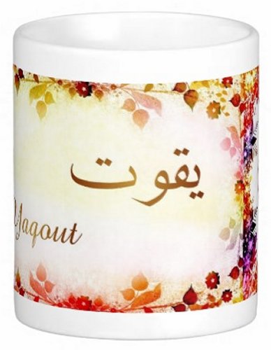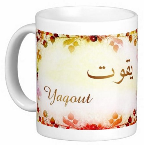 Mug avec le prénom "Yaqout" écrit en français, en arabe (يقوت) et calligraphié de façon artistique en arabe sur la partie droite.