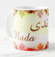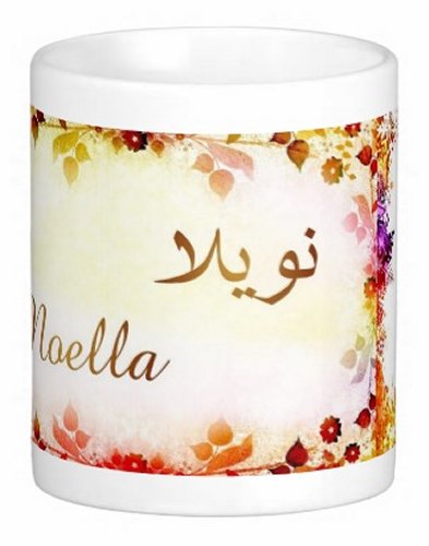 Mug avec le prénom "Noella" écrit en français, en arabe (نويلا) et calligraphié de façon artistique en arabe sur la partie droite.