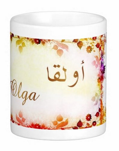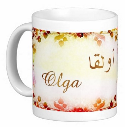 Mug avec le prénom "Olga" écrit en français, en arabe (أولقا) et calligraphié de façon artistique en arabe sur la partie droite.