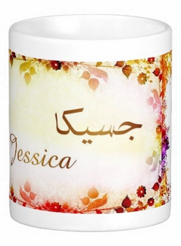 Mug avec le prénom "Jessica" écrit en français, en arabe (جسيكا) et calligraphié de façon artistique en arabe sur la partie droite.