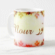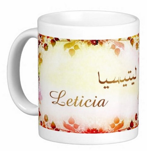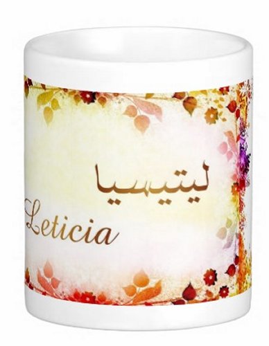 Mug avec le prénom "Leticia" écrit en français, en arabe (ليتيسيا) et calligraphié de façon artistique en arabe sur la partie droite.