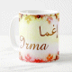 Mug avec le prénom "Lucienne" écrit en français, en arabe (لوسيان) et calligraphié de façon artistique en arabe sur la partie droite.