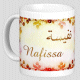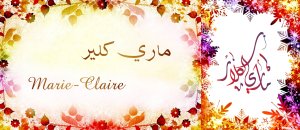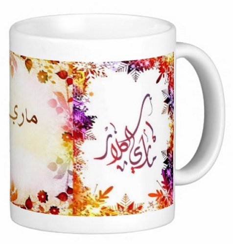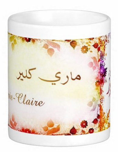 Mug avec le prénom "Marie-Claire" écrit en français, en arabe (ماري كلير) et calligraphié de façon artistique en arabe sur la partie droite.
