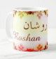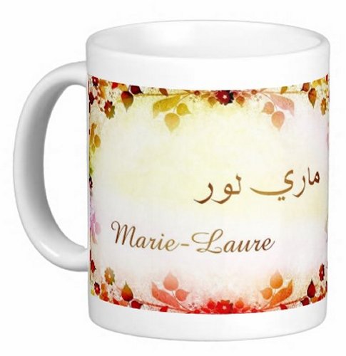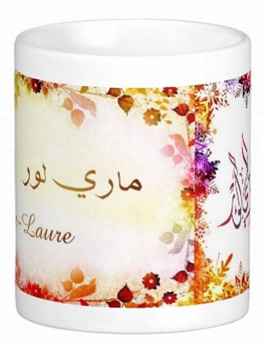 Mug avec le prénom "Marie-Laure" écrit en français, en arabe (ماري لور) et calligraphié de façon artistique en arabe sur la partie droite.