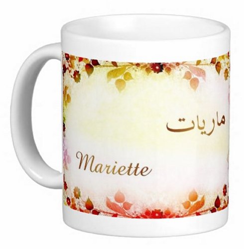 Mug avec le prénom "Mariette" écrit en français, en arabe (ماريات) et calligraphié de façon artistique en arabe sur la partie droite.