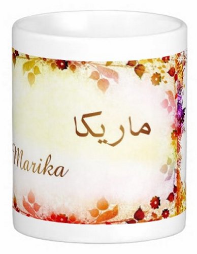 Mug avec le prénom "Marika" écrit en français, en arabe (ماريكا) et calligraphié de façon artistique en arabe sur la partie droite.