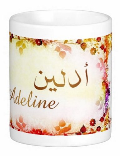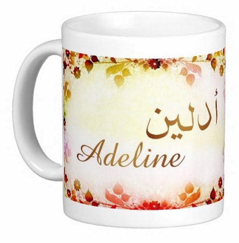 Mug avec le prénom "Adeline" écrit en français, en arabe (أدلين) et calligraphié de façon artistique en arabe sur la partie droite.