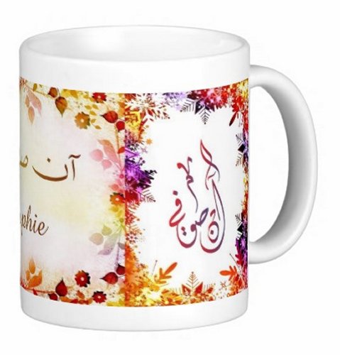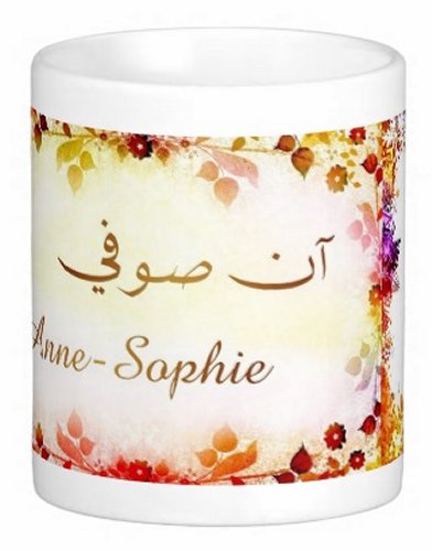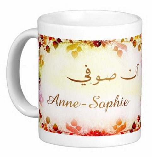Mug avec le prénom "Anne-Sophie" écrit en français, en arabe (آن صوفي) et calligraphié de façon artistique en arabe sur la partie droite.