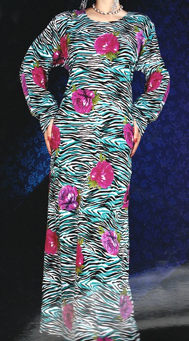 Robe d’intérieur orientale légère et fluide à col rond, à motifs fleuris et strasses sur fond zébré. Manches longues.
