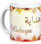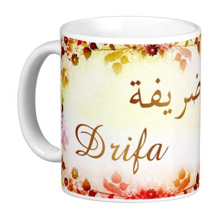 Mug avec le prénom "Drifa" écrit en français, en arabe (ضريفة) et calligraphié de façon artistique en arabe sur la partie droite.