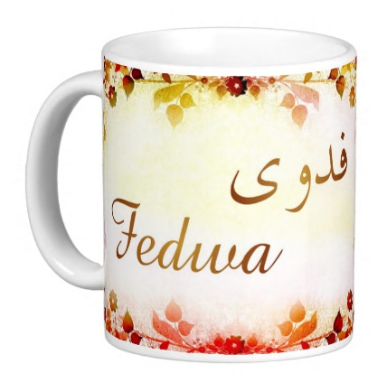 Mug avec le prénom "Fedwa" écrit en français, en arabe (فدوى) et calligraphié de façon artistique en arabe sur la partie droite.