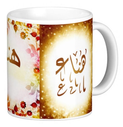 Mug avec le prénom "Hanaa" écrit en français, en arabe (هناء) et calligraphié de façon artistique en arabe sur la partie droite.