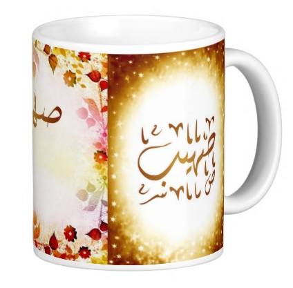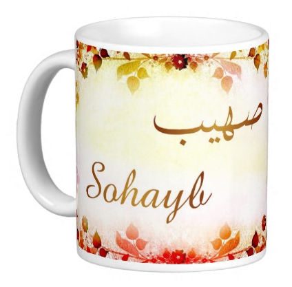 Mug avec le prénom "Sohayb" écrit en français, en arabe (صهيب) et calligraphié de façon artistique en arabe sur la partie droite.