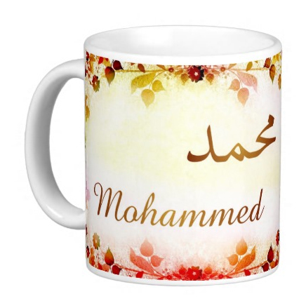 Mug avec le prénom "Mohammed" écrit en français, en arabe (محمد) et calligraphié de façon artistique en arabe sur la partie droite.