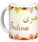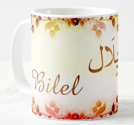 Mug avec le prénom "Bilel" écrit en français, en arabe (بلال) et calligraphié de façon artistique en arabe sur la partie droite.
