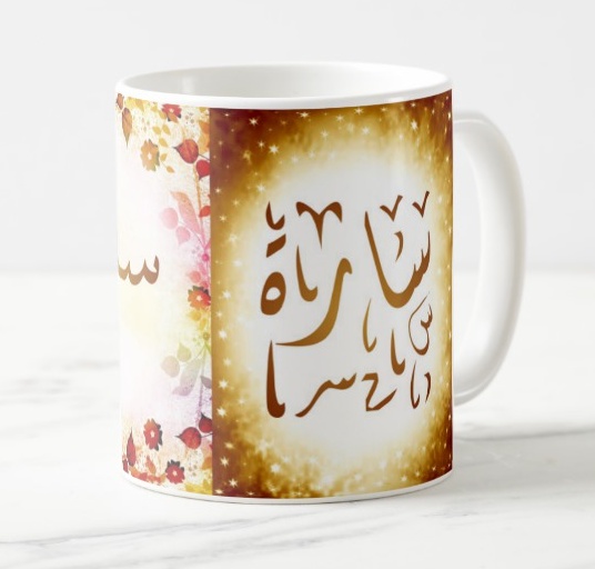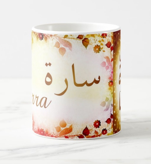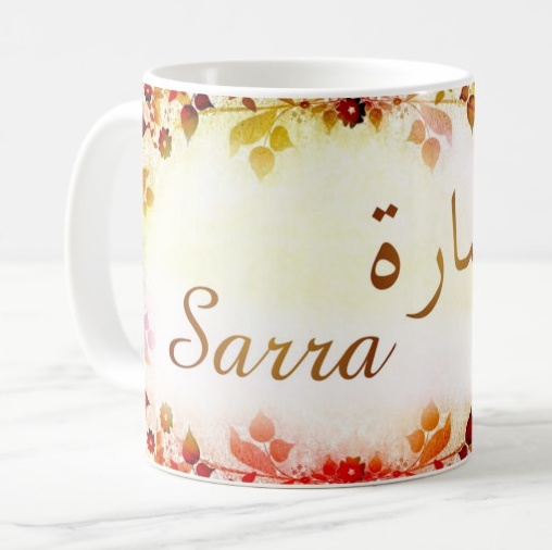 Mug avec le prénom "Sarra" écrit en français, en arabe (سارة) et calligraphié de façon artistique en arabe sur la partie droite.