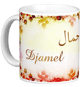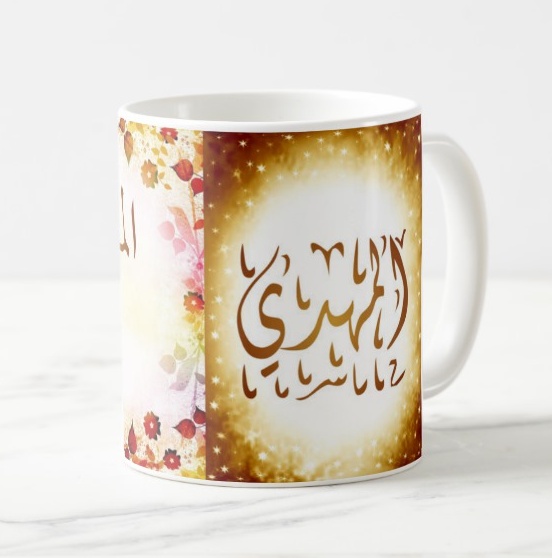 Mug avec le prénom "El Mehdi" écrit en français, en arabe (المهدي) et calligraphié de façon artistique en arabe sur la partie droite.