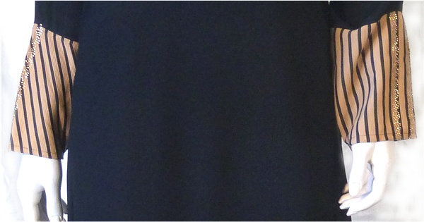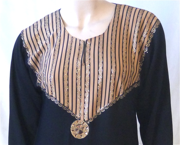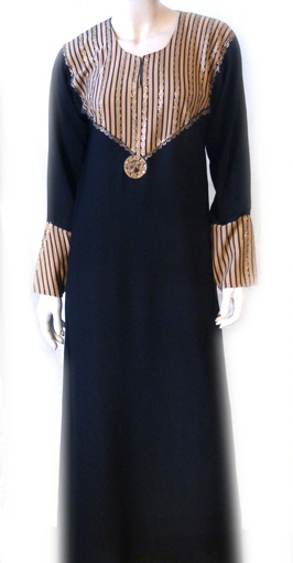 Abaya noire et caramel décorée de strass dorées et d'un magnifique médaillon. Vous retrouvez les mêmes motifs sur le bouts des manches.