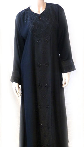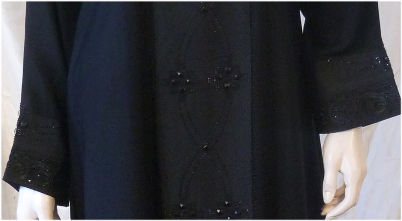 Abaya noire décorée d'une magnifique broderie et de strass noires sur toute la longueur. Vous retrouvez les mêmes motifs sur le bouts des manches. Foulard assorti.