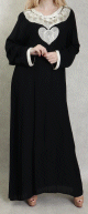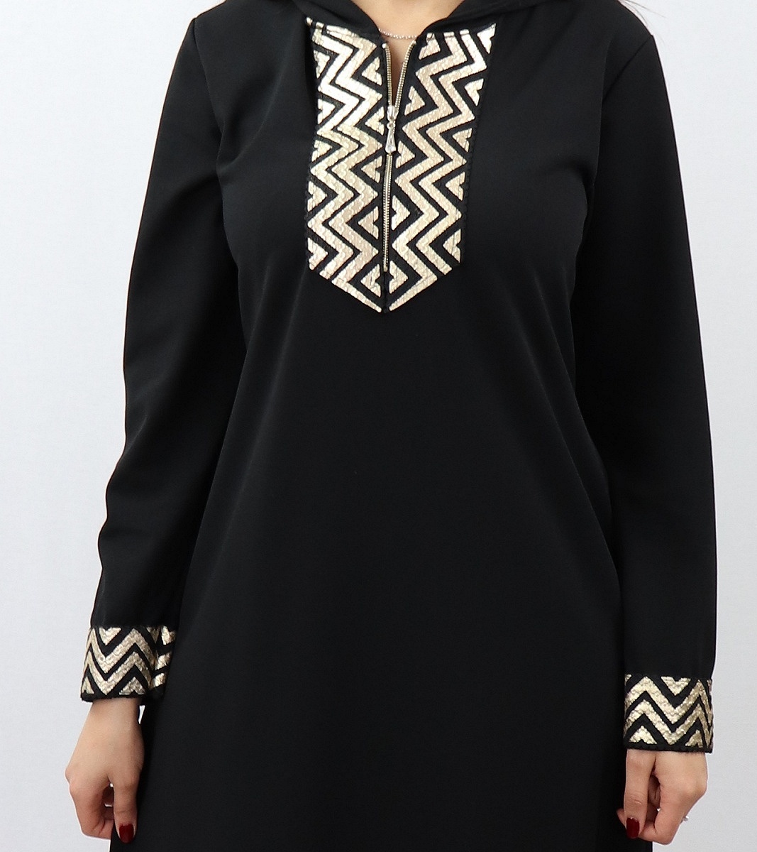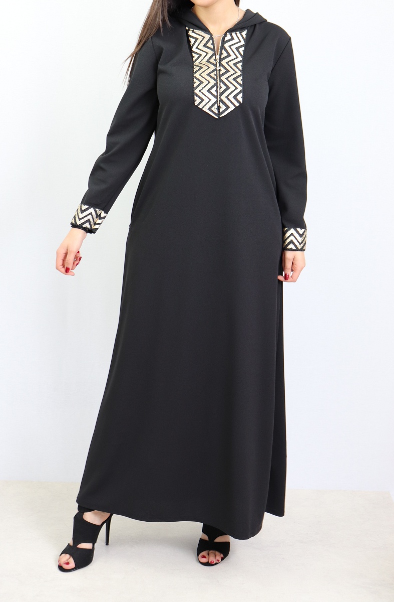 Abaya toute saisons avec capuche et ouverture zip au niveau du cou. Jolis motifs dorés au niveau de la poitrine et des manches, deux poches sur les côtés. Tissu épais (non transparent) et fluide (élastique).