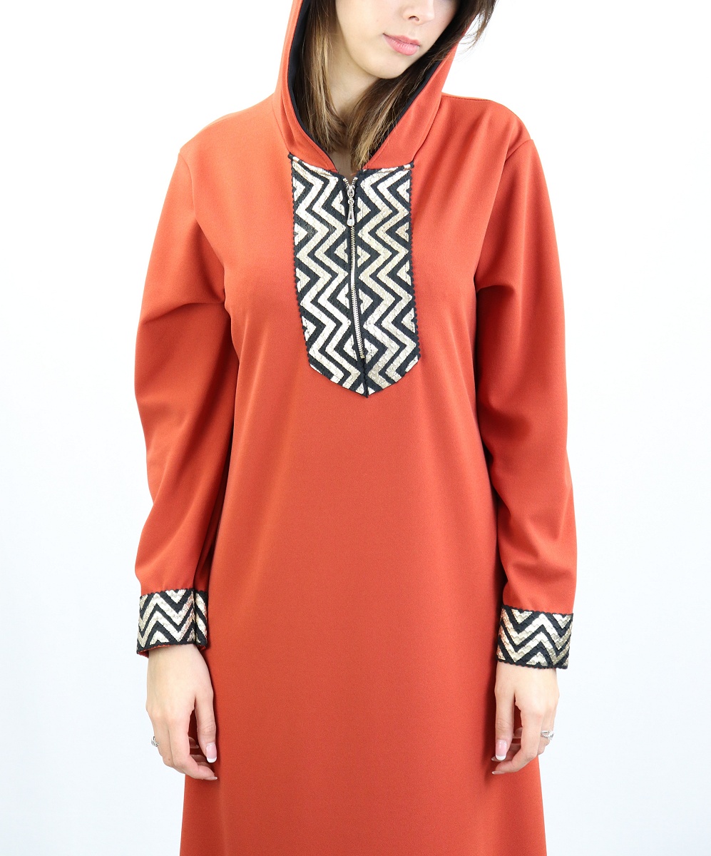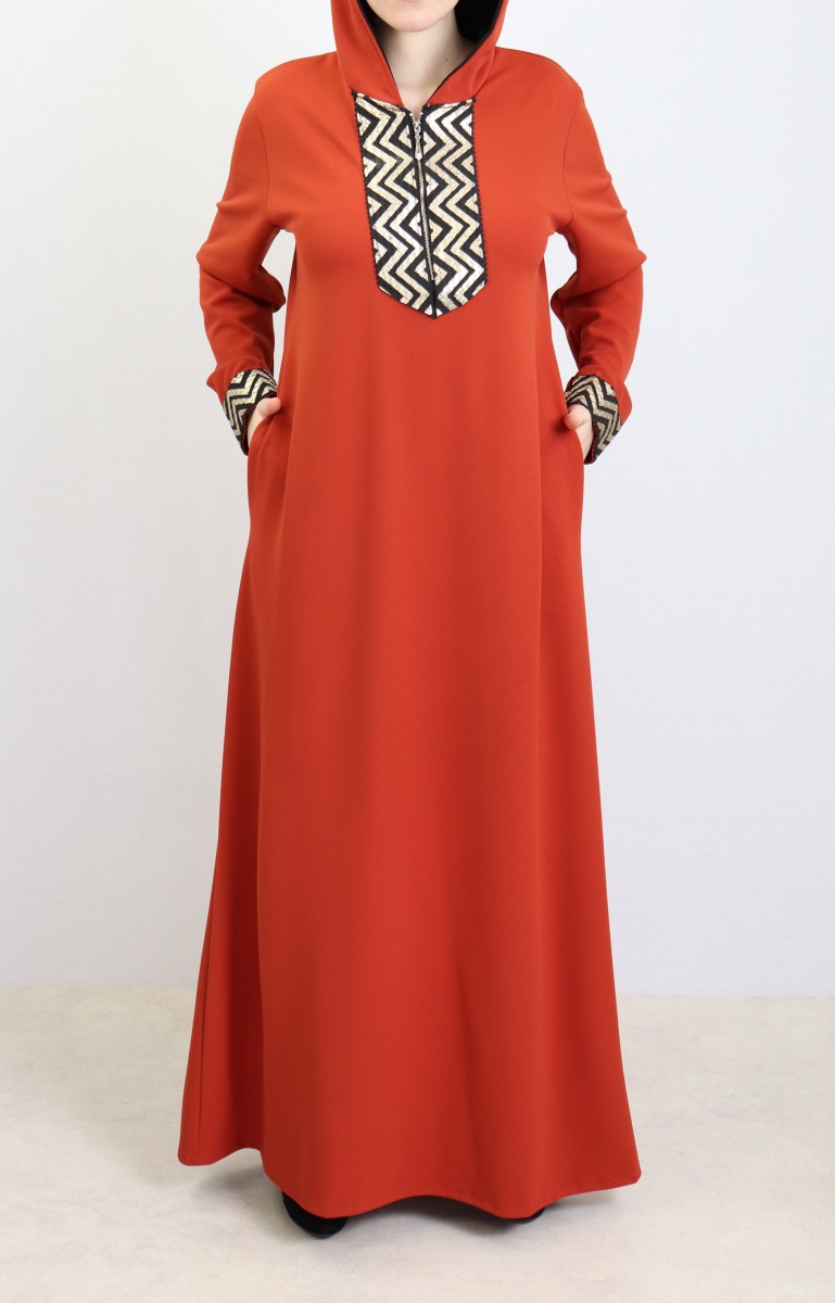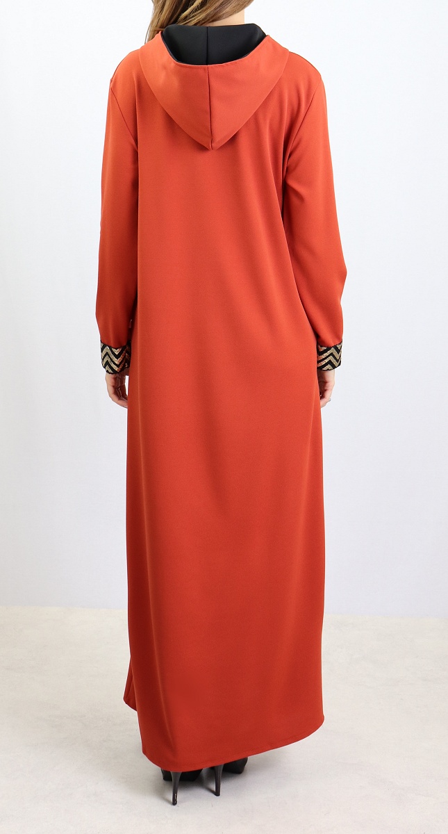 Abaya toute saisons avec capuche et ouverture zip au niveau du cou. Jolis motifs noirs dorés au niveau de la poitrine et des manches, deux poches sur les côtés. Tissu épais (non transparent) et fluide (élastique).