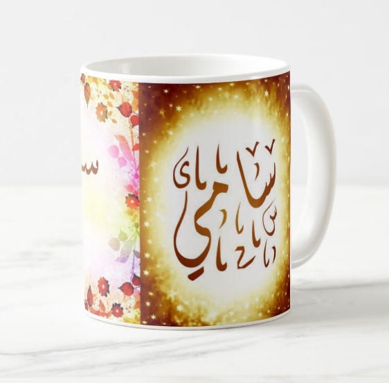 Mug avec le prénom Sami calligraphié en arabe ainsi que son écriture normale en arabe (سامي) et en français.