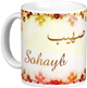 Mug avec le prénom Sajida calligraphié en arabe ainsi que son écriture normale en arabe (ساجدة) et en français.