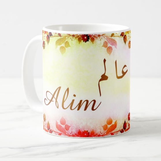 Mug avec le prénom Alim calligraphié en arabe ainsi que son écriture normale en arabe (عالم) et en français.
