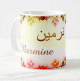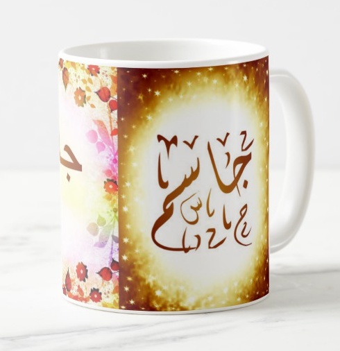 Mug avec le prénom Jessem calligraphié en arabe ainsi que son écriture normale en arabe (جاسم) et en français.