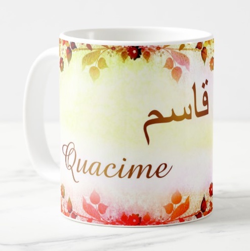 Mug avec le prénom Quacime calligraphié en arabe ainsi que son écriture normale en arabe (قاسم) et en français.