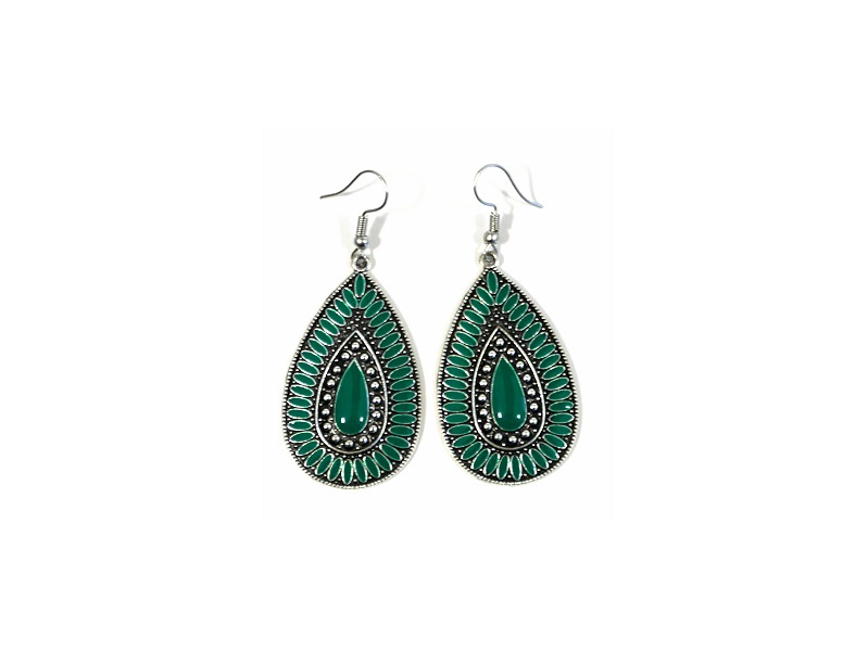 Boucles d'oreilles pendantes en métal argenté ciselé serties de pierres vert foncé - REF. 29621 (5.90 €)