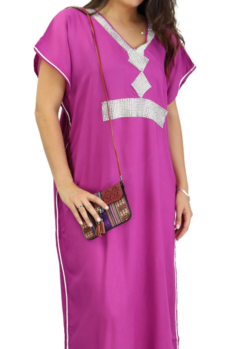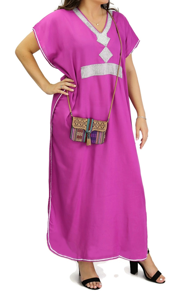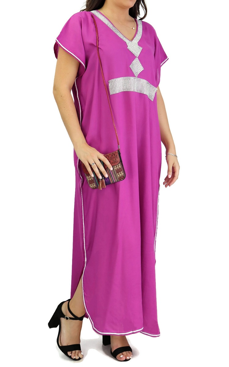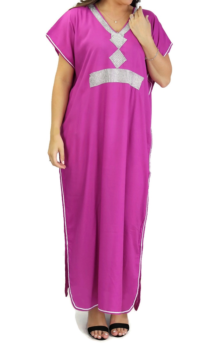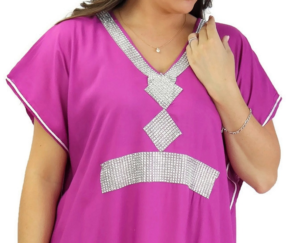 Belle gandoura traditionnelle marocaine, coupe droite col en V avec strass ainsi sur que la taille, ceinture à l'intérieur si on désire un effet cintré.